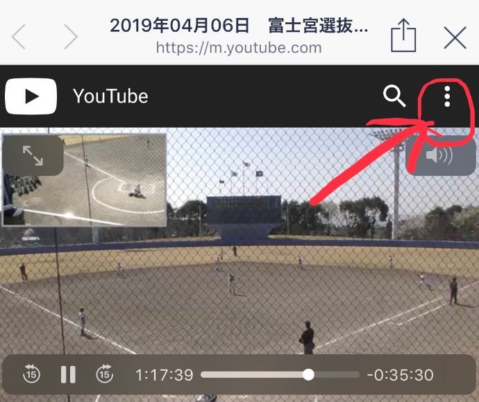 LINEからのURLをタップした場合は、最初はこのようにLINE内でYouTubeを開いてしまうため、スムーズに閲覧するための機能を使えない状態です。そこでYouTubeアプリで開き直す必要がありますので、右上の↑をタップして、YouTubeで開き直します。