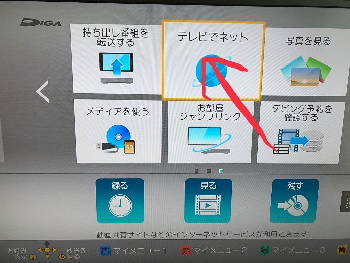テレビの機種にもよりますが、まずテレビリモコンで【ホーム】を押してこの画面を表示し【テレビでネット】を開きます。