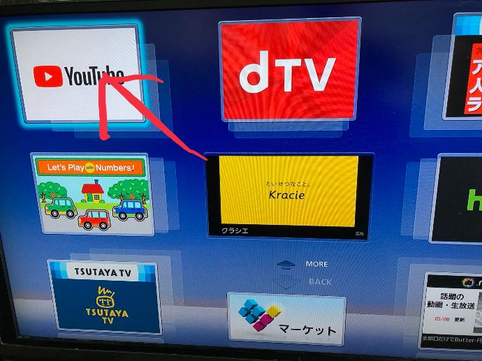 次にYouTubeを開きます。YouTubeが表示されない場合は初期設定などで追加するか、その他の方法を文末に記していますのでそちらを参考にしてください。