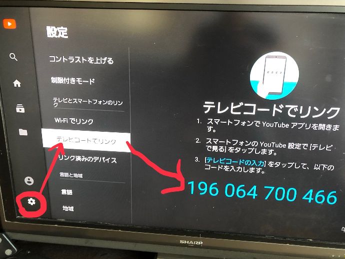 テレビでYouTubeを開くと、画面の左下に設定(ネジマーク)があるのでそちらを選択し、続けて【テレビコードでリンク】をクリックし、12桁のコードを表示させます。