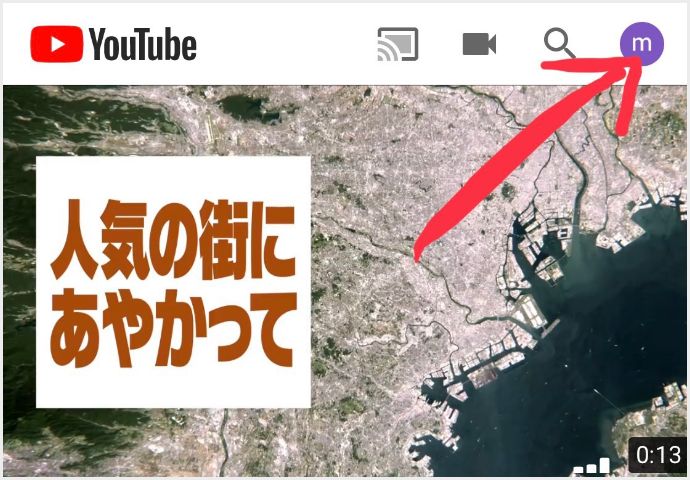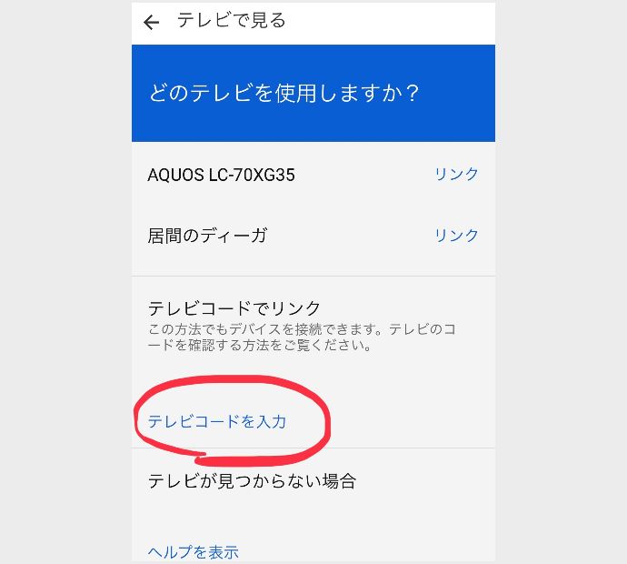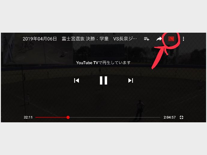 テレビでコードを開いた状態で、スマホのYouTubeアプリの右上の↑の所をタップします。